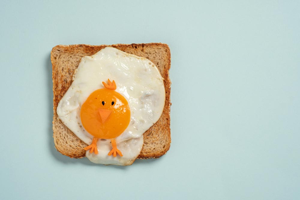 Tip: je kunt het gerecht nog feestelijker maken door het sneetje brood in de vorm van een paashaas of -ei te knippen met een schaar.
